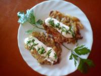 SKŁADNIKI. 0,5 kg świeżych leśnych grzybków(maślaki,podgrzybki) 15dag boczku wędzonego 3 duże cebule pęczek natki pietruszki oliwa do smażenia 4 jajka 3 czubate łyżki mąki wegeta pieprz śmietana Przygotowanie. Umyte i osuszone grzyby drobno posiekać.Na patelni rozgrzać oliwę podsmażyć pokrojony w kostkę boczek i cebulkę.Dodać pokrojone grzybki i smażyć wszystko razem około 15minut.Natkę pietruszki posiekać i połowę dodać do farszu.Doprawić do smaku wegetą i pieprzem,pozostawić do wystudzenia.Do zimnego farszu wbić jajka i wsypać mąkę wszystko razem wymieszać.Na patelni rozgrzać oliwę wykładać łyżką niewielkie placki i smażyć z obu stron na złoty kolor.Gotowe placki polać śmietanką i posypać pozostałą natką pietruszki.