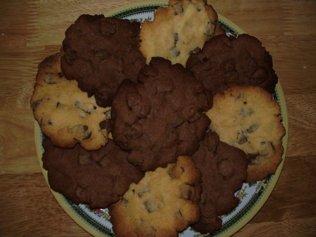 15. SKŁADNIKI: 1 kostka miękkiego masła 15 dag cukru pudru 4 łyżki miodu 1 cukier waniliowy szczypta soli 4 żółtka ok. 300 g mąki (z reguły troszkę więcej) mleczna czekolada (ilość dowolna, ja dałam 3 tabliczki), połamać na małe kosteczki 2 dość czubate łyżki kakao WYKONANIE: Jak chcesz się pobawić w 2 kolory ciastek (tak jak ja), to radzę podzielić wszystkie składniki na pół i do jednej części mąki dosypać kakao i wymieszać. Zostawić czekoladę i z reszty składników zagnieść ciasto. Nie przesadzić z mąką, ciasto ma być trochę tłustawe i delikatnie się kleić. jak ciasto się wymiesza, dosypać kawałki czekolady i porządnie zagnieść. Odrywać niewielkie porcje z gotowego ciasta i rozgniatać na blaszce (nie trzeba blachy smarować), najlepiej na nierównomierne okrągłe kształty, na tym polega efekt. Piec w temp. 190st.C przez ok. 15 min. (w piekarniku na prąd niecałe 180st.C). Po upieczeniu poczekać kilka minut ze zdejmowaniem z blachy to będą łatwiej odchodzić. Ciastka są kruche. To wszystko. Nie trzeba dawać dżemów ani cukru na wierch, ciasteczka same w sobie są wystarczająco dobre. Mam nadzieje że zasmakują bo to mój wypiekowy eksperyment. Zobaczyłam takie ciacha w sklepie i stwierdziłam, że wykombinuję coś tego typu :-D