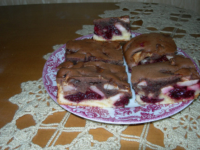 80 dag mąki 1 kostka margaryny 40 dag cukru 6 jaj 3/4 szklanki mleka 2 łyżki kakao 2 łyżeczki proszku do pieczenia owoce - śliwki , jabłka, agrest Utrzeć margarynę z cukrem i jajami, dodać makę wymieszaną z proszkiem do pieczenia dolewając po trochu mleka. Wyrobione ciasto podzielić na 2 części, do jednej dodać kakao. Na dużą blachę prostokątną wylać białe ciasto, na to nałożyc owoce i przykryć ciastem kakaowym. Piec około 50 minut. Ciasto które przedstawiam piekłam z śliwkami z słoi i surowymi jabłkami obranymi i pokrojonymi w plasterki. ina12