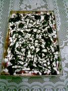 Ugotować budyń śmietankowy z 1 łyżką mąki, po ostudzeniu połączyć z kostką masła. Wszystko wyłożyć na biszkopt. Potem na to kładziemy dżem z czarnej pożeczki. Jak chcemy aby był rzadszy dżem to warto go zmiksować. Wtedy będzie łatwiej smarować na masie budyniowej. Na to kładziemy pokruszone bezy ok. 10 dag. Muszą być pokruszone drobnitko. Na wierzch polewa. Ja mam z czekolady gorzkiej i kakao.