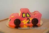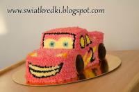 Witam chciałam pokazać tort, który upiekłam dla synka na drugie urodziny, oto krótka instrukcja: najpierw upiekłam biszkopt z 10 jaj o wymiarach 25x30 cm, przekroiłam na 3 blaty. wykroiłam podstawę tortu o szerokości ok 13-14 cm, następnie wykroiłam górę i wszystko przełożyłam bitą śmietaną i brzoskwiniami, nadałam finalny kształt i całość obsmarowałam masą maślaną. aby było mi łatwiej narysowałam mniej więcej na torcie rysunki jakie będę wyciskać. koła zrobione z delicji (mogą być inne ciastka) I później już sama dekoracja wyciskana za pomocą tylek cukierniczych. krem barwiony barwnikami w proszku, oprócz czerwonego - specjalnie kupiłam pierwszy raz barwnik w żelu, bo myślałam że da mi intensywnie czerwony kolor - a barwnik okazał się klapą i dlatego zygzak jest właściwie różowy a nie czerwony :/ miałam w domu bordowy w proszku ale bałam się że mi wyjdzie nie wiadomo jaki kolor, a już nie miałam masła więc nie chciałam ryzykować. zdjęcia raczej niewiele mówią o tym jak go zrobić dlatego zapraszam do obejrzenia filmu: zdjęcia tortu