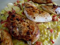 Skladniki na 4 porcje: - 4 piersi z kurczaka - becon / boczek chudy pokrojony w kosteczke - jedna cebula drobno pokrojona - 2 glowki czosnku, zmiazdzone - 1 czerwona papryka, pokrojona w kostke - 1 1/2 lyzki maki - niepelna szklanka mleka - 50ml slodkiej smietany - puszka kukurydzy (365g) - puszka fasolki Jaska (400g) - maslo ok 50g - olej - przyprawy 1. Usmazyc kurczaka na oleju, na srednim ogniu, az zbrazowieje. Kiedy kurczak jest gotowy, zdjac z patelni i na tym samym tluszcu usmazyc becon. Kiedy becon bedzie gotowy, nalezy go zdjac z patelni lyzka cedzakowa. 2. Wylac olej z patelni i rozpuscic maslo. Usmazyc najpierw cebule i czosnek az zmiekna, potem dodac papryke, i smazyc na malym ogniu az zmieknie. 3. Dodac make i smazyc przez minute, potem stopniowo dodawac mleko i mieszac az sos bedzie gladki. Dodac smietane. Potem dodac becon, kukurydze, fasole i przyprawy. 4. Po czym wszystko przelozyc do naczynia zaroodporego z kurczakiem na wierzchu i piec w rozgrzanym piekarniku w ok 200 st.C. okolo 25 minut (ja podlewalam kurczaka troche przegotowana woda, ktora potem i tak sie wygotowala w trakcie pieczenia, zeby nie byl za suchy). Podawac z fasolka szparagowa - ja mialam ziemniaki - tez ok :grin: Jak dla mnie super! Smacznego! :D