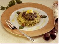 Dla 4 osób. Składniki: 2 łyżki stołowe oliwy z oliwek puszka kasztanów jadalnych obranych 2 ząbki rozgniecionego czosnku 3 łyżki stołowe masła 250 g cienko pokrojonych grzybów 1 łyżka ziół ( pietruszka, tymianek, majeranek, szczypiorek itp.) 250 g makaronu penne starty ser Parmezan sól pieprz Przygotowanie: Posiekać kasztany. Rozgrzać w dużej patelni oliwę z oliwek i smażyć kasztany aż przybiorą złoty kolor. Dodać czosnek i smażyć jeszcze przez minutę. W drugiej patelni rozpuścić masło i smażyć grzyby aż zmiękną. Dodać wcześniej podsmażone kasztany oraz zioła i wszystko wymieszać. Można dodać odrobinę pieprzu i soli dla smaku. W międzyczasie gotować makaron penne aż będzie al dente. Gdy makaron będzie już gotowy, dodać sos i posypać startym Parmezanem.