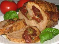 Schab faszerowany pomidorami Taki pyszny schab upiekła nam na święta Irena :grin: SKŁADNIKI: 1 kg schabu bez kości, słoik suszonych pomidorów w oleju, 4-5 łyżek marynowanych oliwek nadziewanych papryką, 2-3 ząbki czosnku, 2 łyżki masła, łyżka miodu, zioła prowansalskie, świeża bazylia, sól, pieprz SPOSÓB WYKONANIA: Mięso umyć, osuszyć, rozciąć wzdłuż dłuższego boku, nie przecinać do końca, tak, aby uzyskać prostokątny płat. Natrzeć z obu stron rozgniecionym czosnkiem, oprószyć ziołami prowansalskimi, solą i pieprzem. Odstawić pod przykryciem do lodówki na 1-2 h. Pomidory i oliwki osączyć z zalewy, ułożyć na płacie mięsa. Mięso mocno zwinąć w roladę, obwiązać bawełnianą nicią. Na patelni rozgrzać masło i obsmażyć mięso ze wszystkich stron. Ułożyć w brytfance, polać tłuszczem ze smażenia i wlać kilka łyżek wody. Piec w rozgrzanym piekarniku w temp. 180 st. C, często polewając sosem z pieczenia. 10 min. przed końcem pieczenia mięso posmarować miodem i posypać świeżo mielonym pieprzem. Gotową pieczeń wyjąć na półmisek, usunąć nici, pokroić na plastry. Udekorować listkami bazylii. Smacznego!!