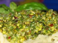 Makaron pesto W oryginale pesto robi się z orzeszków sosnowych pignolia zwanych też pinii. Niestety nie są one u nas popularne, więc swego czasu wpadłem na to aby zastąpić je pistacjami, które się świetnie sprawdzają w tej roli. Składniki: makaron spaghetti 1/4 szklanki oliwy 2 ząbki czosnku duża garść świeżej bazylii 2 łyżki parmezanu 1 opakowanie 100g pistacji sól do smaku Obrane z łupinek pistacje włożyć do miksera. Dodać oliwę, czosnek, bazylię oraz parmezan. Całość zmiksować i doprawić do smaku solą. Podawać z ugotowanym al dente makaronem spaghetti. Smacznego!!