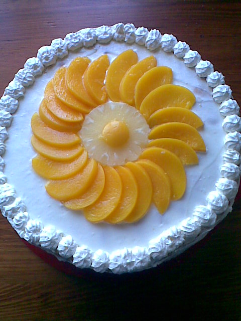 Tort ma trzy placki biszkoptowe z trzech jajek a w masie oprócz ananasów dałam jeszcze brzoskwinie i galaretkę zieloną pokrojoną w kostkę a reszta jak w przepisie polecam bo jest bardzo lekki i nie słodki.