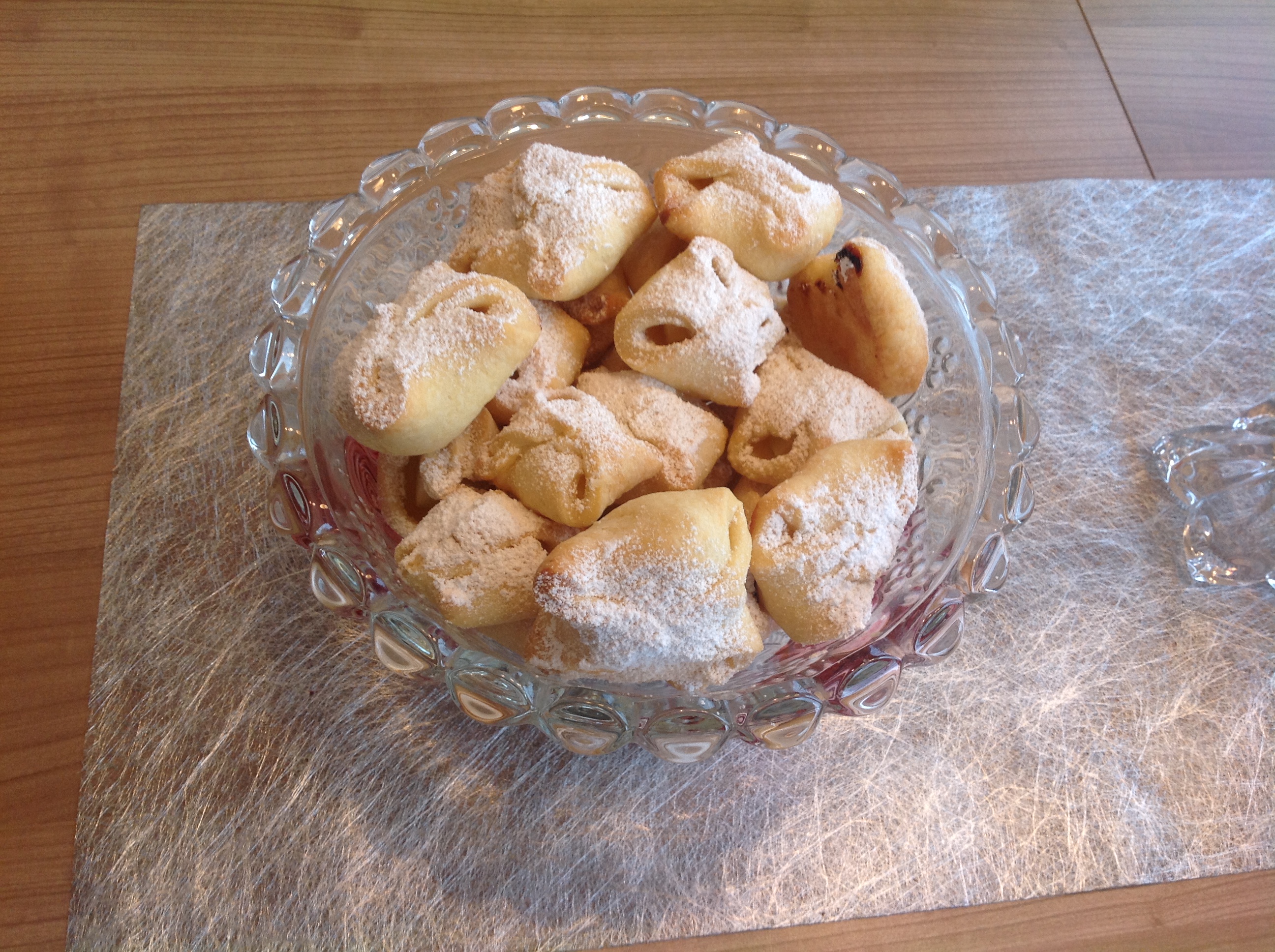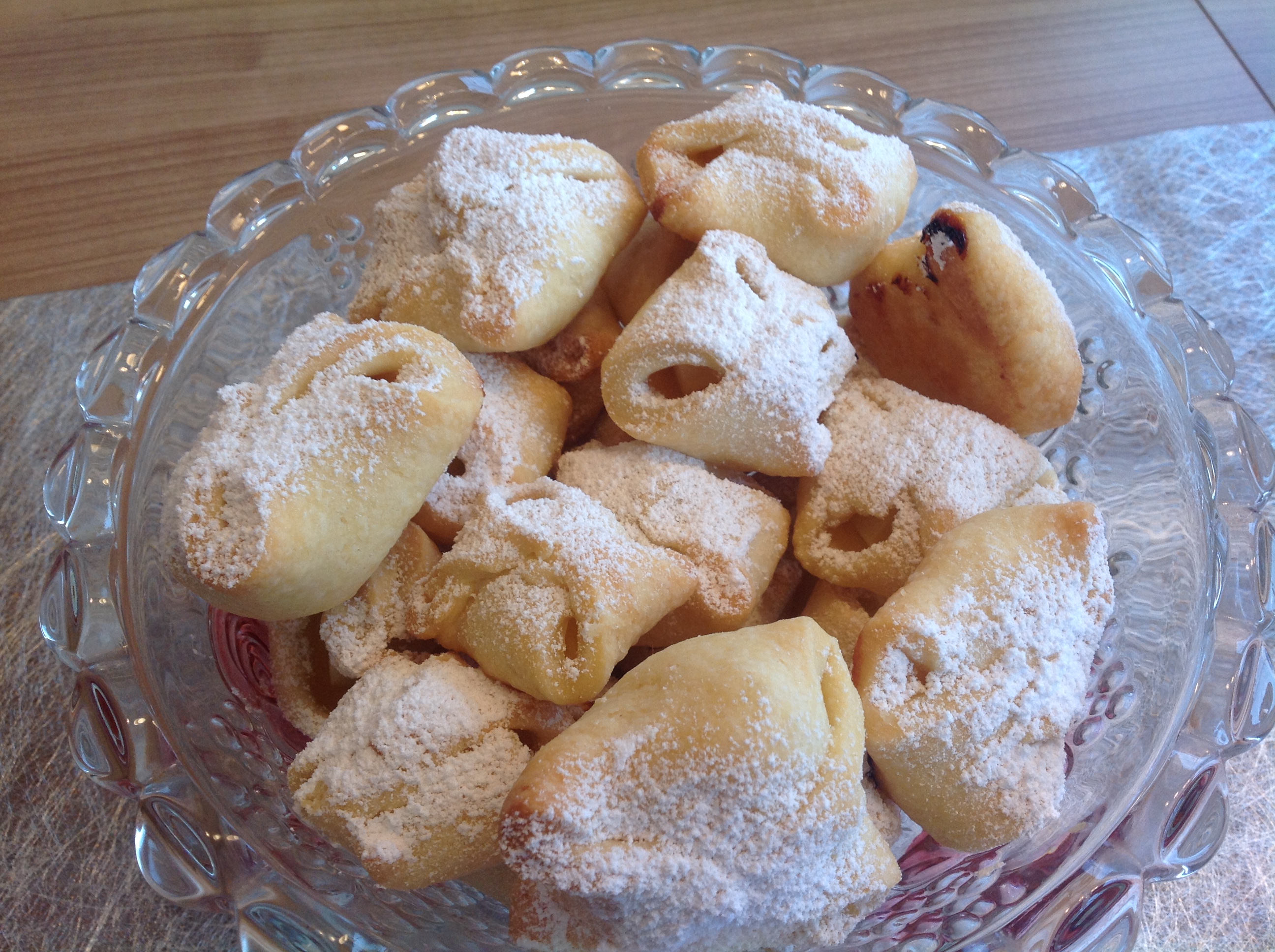 3 szkl. mąki 2 cukry waniliowe 250 g masła 1/2 -3/4 szkl. śmietany 1 żółtko szczypta soli 3 jabłka cukier cynamon cukier puder Zagniesc kruche ciasto z mąki, masła, cukru waniliowego, żółtka i śmietany, nalezy dodawać ją stopniowo , ciasto powinno byc plastyczne. Jablka pokroić w dużą kostkę, moczyć w cukrze i cynamonie. ciasto cienko rozwałkować i wycinać kwadraty mniej wiecej 4 na 4 cm. Układać na każdym kwadracie kawałek jabłka. Zebrać wszystkie rogi do góry i lekko skleić. Piec w 180'C ok. 20 min na złoty kolor. Wystudzić i posypać cukrem pudrem.
