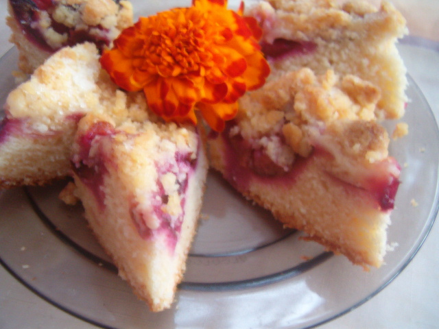 CIASTO *1 masło roślinne 250 dag *1 szkl cukru *4 jaja *2,5 szkl mąki *2 łyżeczki proszku do pieczenia *owoce sezonowe (tutaj sliwki) NA KRUSZONKĘ *2 szkl mąki *1/2 kostki rozpuszczonej margaryny *1/2 szkl cukru Masło roślinne utrzeć z cukrem, do powstałej masy dodawać po jajku i po 1/2 szkl mąki wymieszanej z proszkiem. Ciasto wyłożyć na blachę, na ciasto kładziemy owoce, które posypujemy cukrem. Składniki kruszonki wrzucamy do miski i traktujemy porzadnie robotem :grin:, a nastepnie sypiemy kruszonke i posypujemy na koncu cale ciasto cukrem Pieczemy 50 minut w 180 C. Ulubione ciasto moich dzieci.