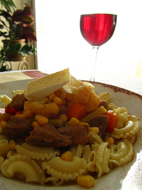 Składniki: 30 dag wołowiny 30 dag wieprzowiny pół kalafiora pół paczki makaronu 2 duże marchewki dwie garści fasolki szparagowej dwa kieliszki czerwonego wina duża cebula olej majeranek sól, pieprz papryka słodka i ostra masło 2 ząbki czosnku Przepis na gulasz z makaronem: Zaczynamy od pokrojenia mięs w kostkę o bokach ok. 3 cm. Na rozgrzany olej wrzucamy osuszone papierowym ręcznikiem kawałki mięs. Po przysmażeniu na bardzo mocnym ogniu dodajemy dwie łyżki masła, posiekaną w kostkę cebulę, czosnek, majeranek, sproszkowane papryki oraz pieprz. Po chwili przesmażania dodajemy kieliszki wina. Dusimy parę minut (bez przykrycia) – aby alkohol wyparował. Następnie przykrywamy i dusimy na małym ogniu przez ok. 1 h. Później dorzucamy pokrojoną w plasterki marchew, po paru minutach wędruje do garnka fasolka. Jeśli będzie za mało płynu można dolać wody. Całość dusimy do miękkości. 6 minut przed końcem dodajemy różyczki kalafiora. Jeśli ktoś lubi można dodać zaklepkę – ja jednak powoli od niej odchodzę. Całość podajemy z ugotowanym makaronem (można również surowy makaron wrzucić do gulaszu, aby w nim się ugotował – wtedy powstaje prawdziwe danie jednogarnkowe). https://www.codogara.pl/3161/gulasz-z-makaronem/