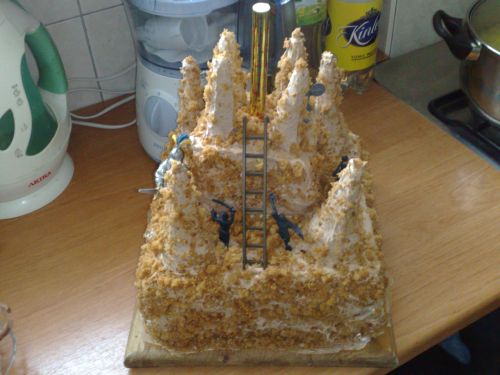 Witam. Bardzo ładne macie torciki :wub: fajne pomysły macie dziewczyny. Pokaże swój pierwszy torcik dla Synusia na 7 urodzinki :blush: . Baardzo lubi okres średniowiecza...rycerzy...oraz wszystkiego co się z tym wiążę :biggrin: Dlatego taki torcik, ale figurki niestety zabawkowe :wink: . Próbowałam sama s masy marcepanowej coś ulepić :wacko: , ale jak się okazuje nie mam takich zdolności plastycznych :cool: , więc pożyczyłam rycerzy i drabinkę u Syna :biggrin: