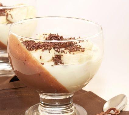 • Zalewam pucharki jasną masą i wstawiam do lodówki. Kiedy masa zastygnie dekoruję bananami i czekoladą (np. posypka, nutella).
